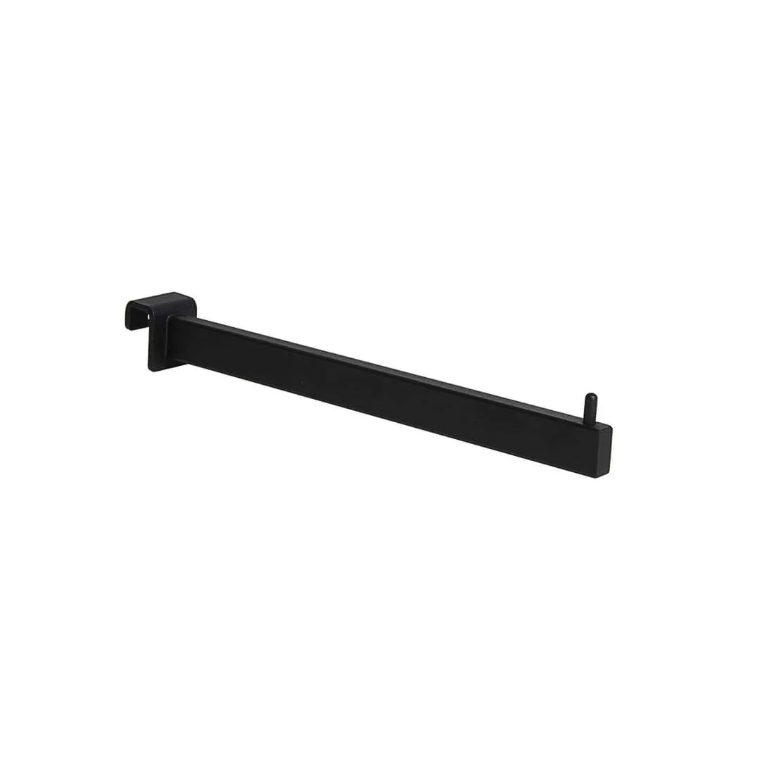 Abhängearm aus Rechteckrohr mit Aufnahmeadapter für Tragestangen aus Rechteckrohr 30 x 15 mm, schwarz Struktur. Hochwertige Verarbeitung durch eine geschweißte und polierte Endkappe. Ein zylindrischer Pin dient als Begrenzungshalter.