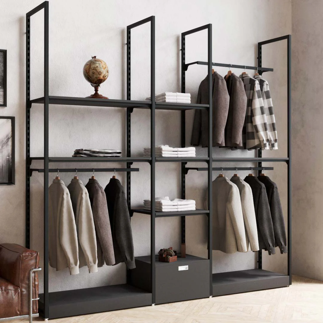 Dieses stilvolle Regal in der Breite von 265,5 cm eignet sich perfekt für die Präsentation von Herrenmode oder für jede Modeboutique, die nach dynamischen Produktpräsentationslösungen sucht. Mit den verstellbaren Fachböden und Konfektionsstangen war es noch nie so einfach, visuell interessante Produktbilder zu gestalten.