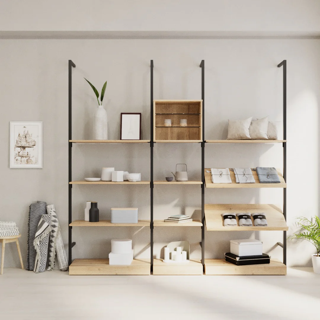 Mit dem Regalsystem Ceres Style 4 erhalten Sie eine große Vielfalt an Präsentationsmöglichkeiten. Mit geraden und schrägen Fachböden, einer Präsentationsbox und Holzsockeln können verschiedene Produkte wie Vasen, Teller oder Kerzen elegant präsentiert werden.