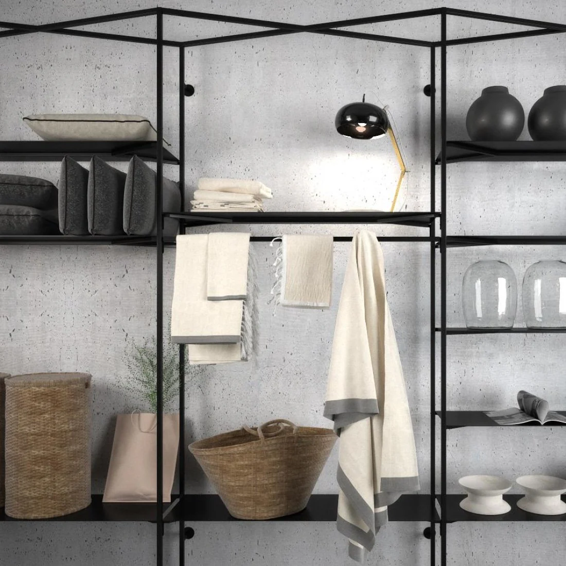 Es besticht durch sein zierliches, ultraschlankes Profil und höchste Funktionalität in zeitloser Gestaltung. Höhenverstellbare Blechböden und Tragestangen sind in der Form auf das Wesentliche reduziert. Eine hochwertig beschichtete Oberfläche verleiht eine wertvolle Ästhetik.