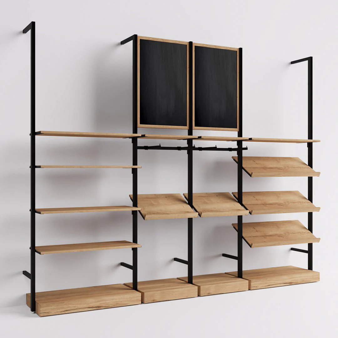 Verleihen Sie Ihrer Bäckerei oder Ihrem Feinkostgeschäft mit diesem 328 cm breiten Regalsystem einen besonderen Stil. Die Vielzahl von geraden und schrägen Fachböden ermöglicht eine optimale Nutzung Ihrer Wandfläche. So präsentieren Sie stilvolle eine breite Palette von Backwaren und ähnlichen Produkten.