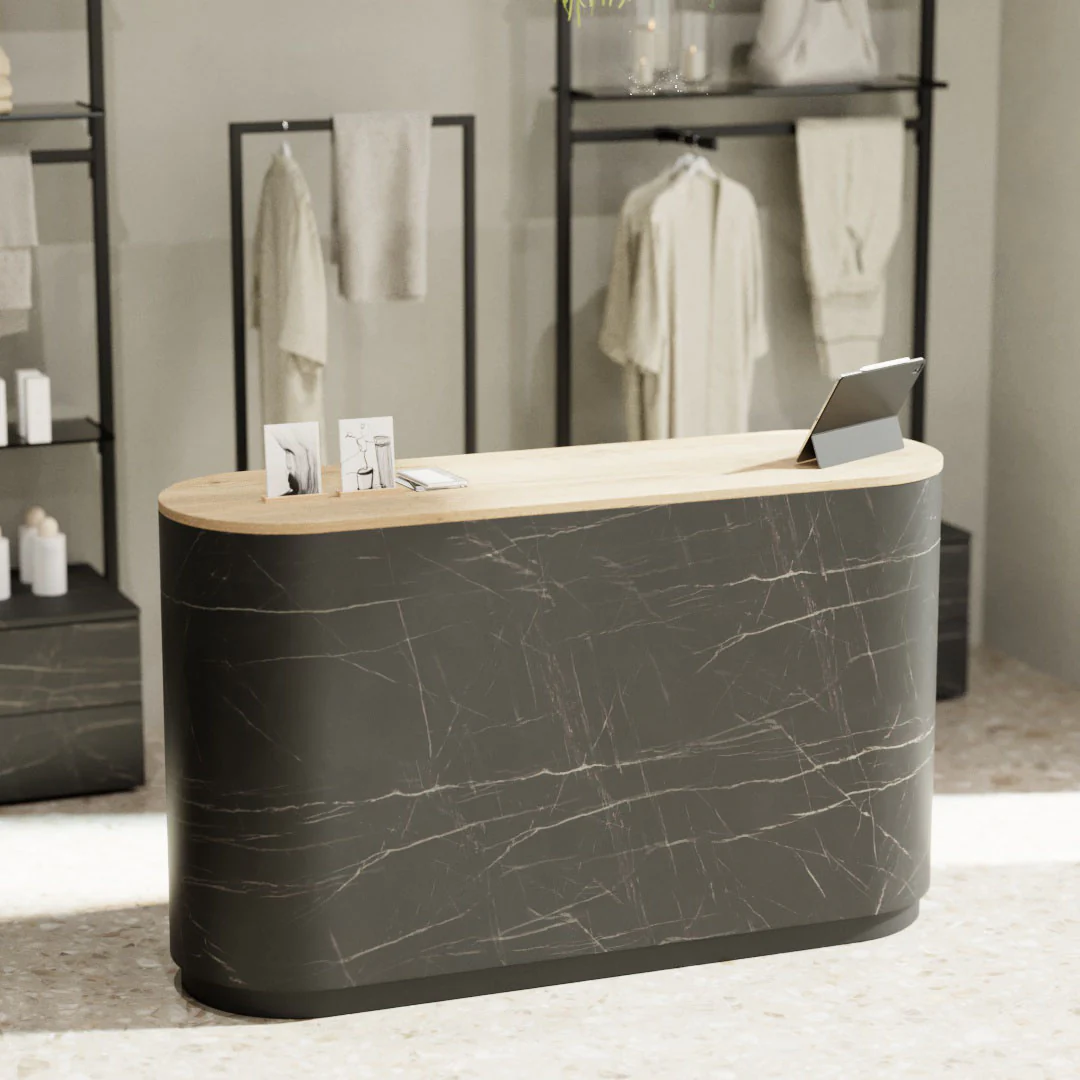 Geben Sie Ihren Raum eine besondere Note. Mit dem ovalen Verkaufstresen Coco erhalten Sie einen wunderschönen Eyecatcher fürs Geschäft oder das Büro. Formschön und mit handwerklicher Perfektion unterstreicht dieser Tresen die Wertigkeit Ihres Unternehmens. Breite: 150 cm.
