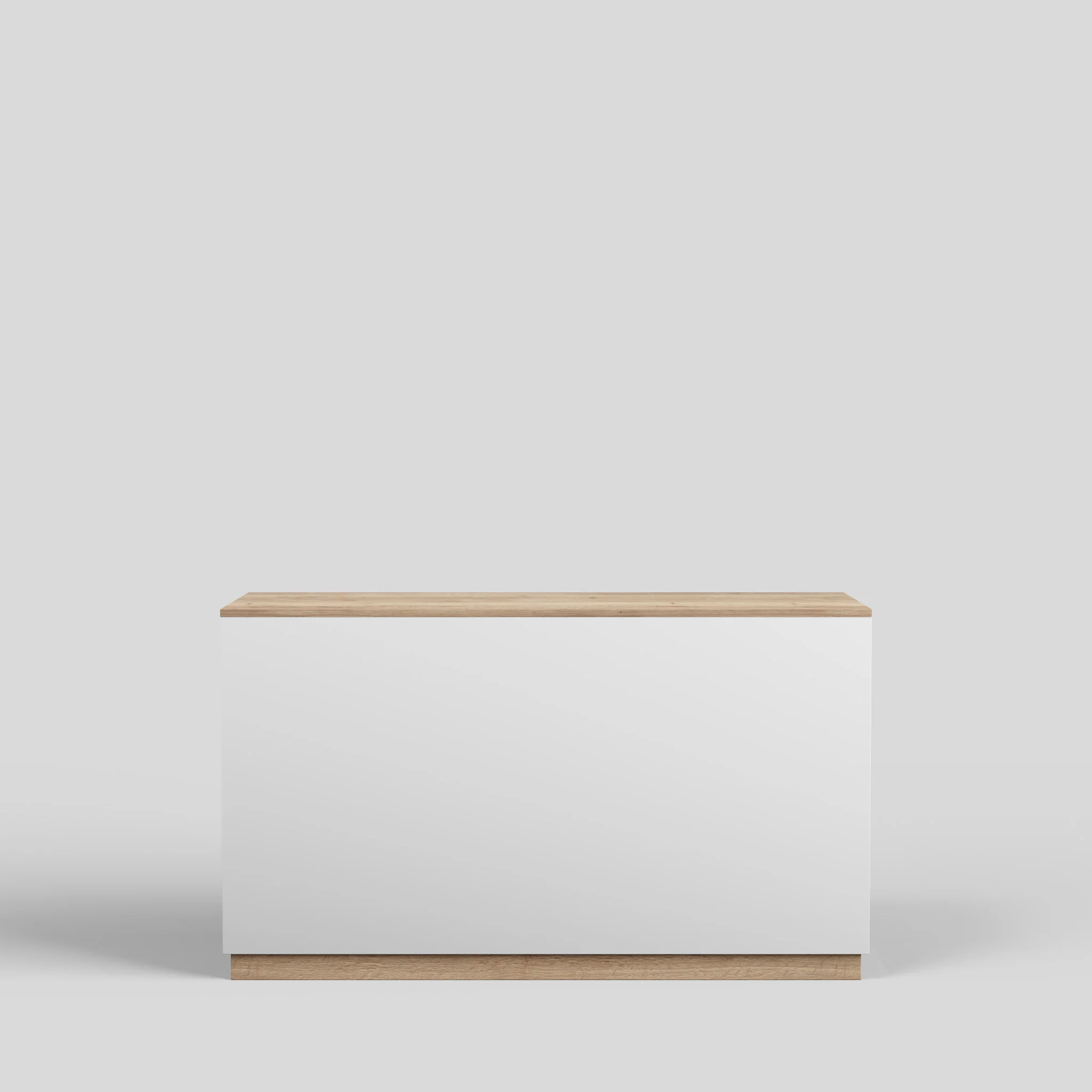 Der Java Tresen überzeugt durch sein stilvolles Design und passt sich mühelos in verschiedene Raumkonzepte ein. Die obere Platte im Eiche-Dekor verleiht dem Tresen eine edle Note und schafft einen einladenden Ort für Kundengespräche. Der weiße Korpus sorgt für ein klares und modernes Erscheinungsbild. Dank der funktionalen Ausstattung mit zwei Schubladen und höhenverstellbaren Einlegeböden wird der Tresen zu einem flexiblen Helfer im Verkaufsbereich.