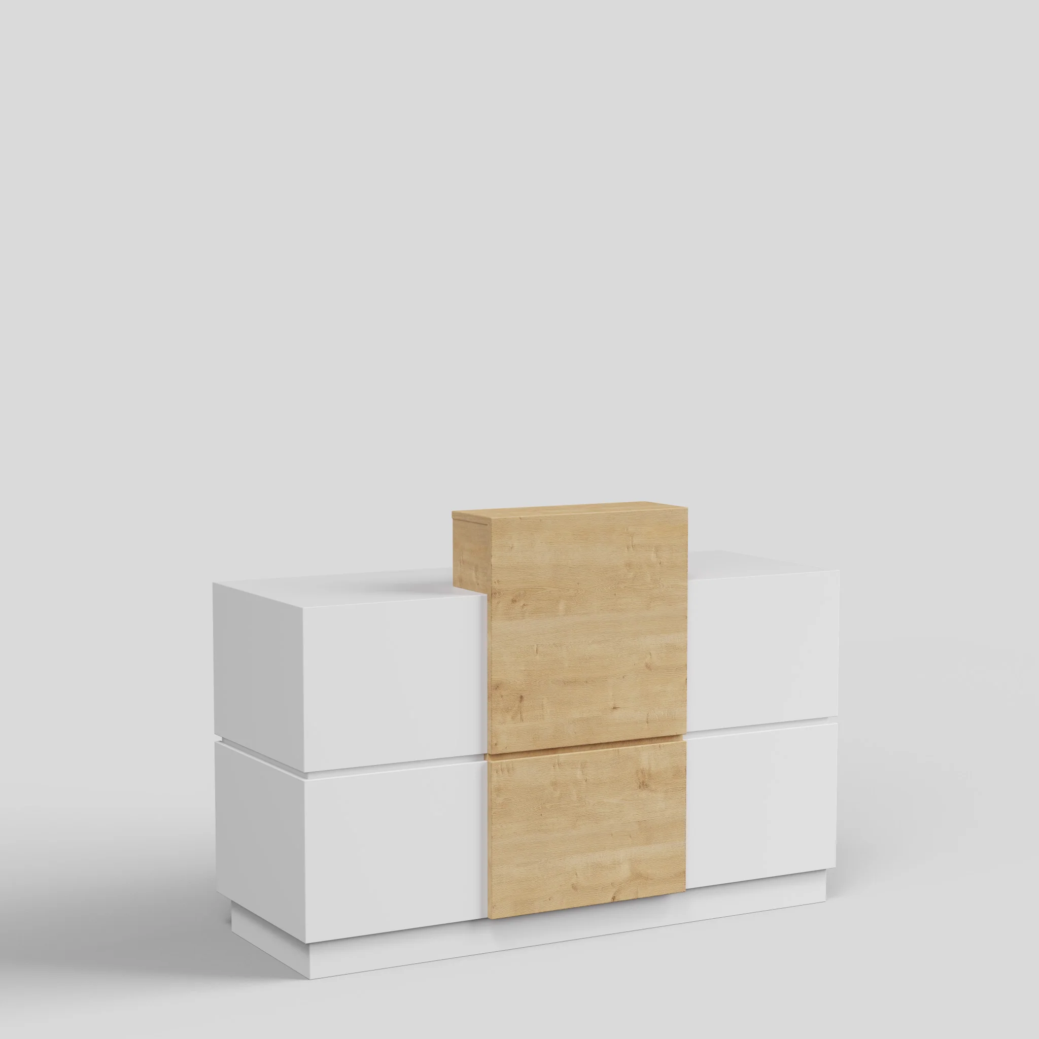 Dieser Tresen für den Kassenbereich steht für ein zeitloses und modernes Design. Durch die Verwendung von beschichteten Spanplatten und ABS Sicherheitskanten können ganz individuelle Farbvarianten kombiniert werden. Somit fügt sich der Verkaufstresen harmonisch in das jeweilige Raumkonzept ein. Die Frontverkleidung der Kassentheke ist dabei ein besonderes Highlight. Optional lässt sich auf der Vorderseite auch ein Logo integrieren. Die Tischplatte ist bereits mit einem Kabeldurchlass ausgestattet. Rückseitig bietet die Kassentheke mit 6 Schubkästen und 2 Türen reichlich Stauraum.