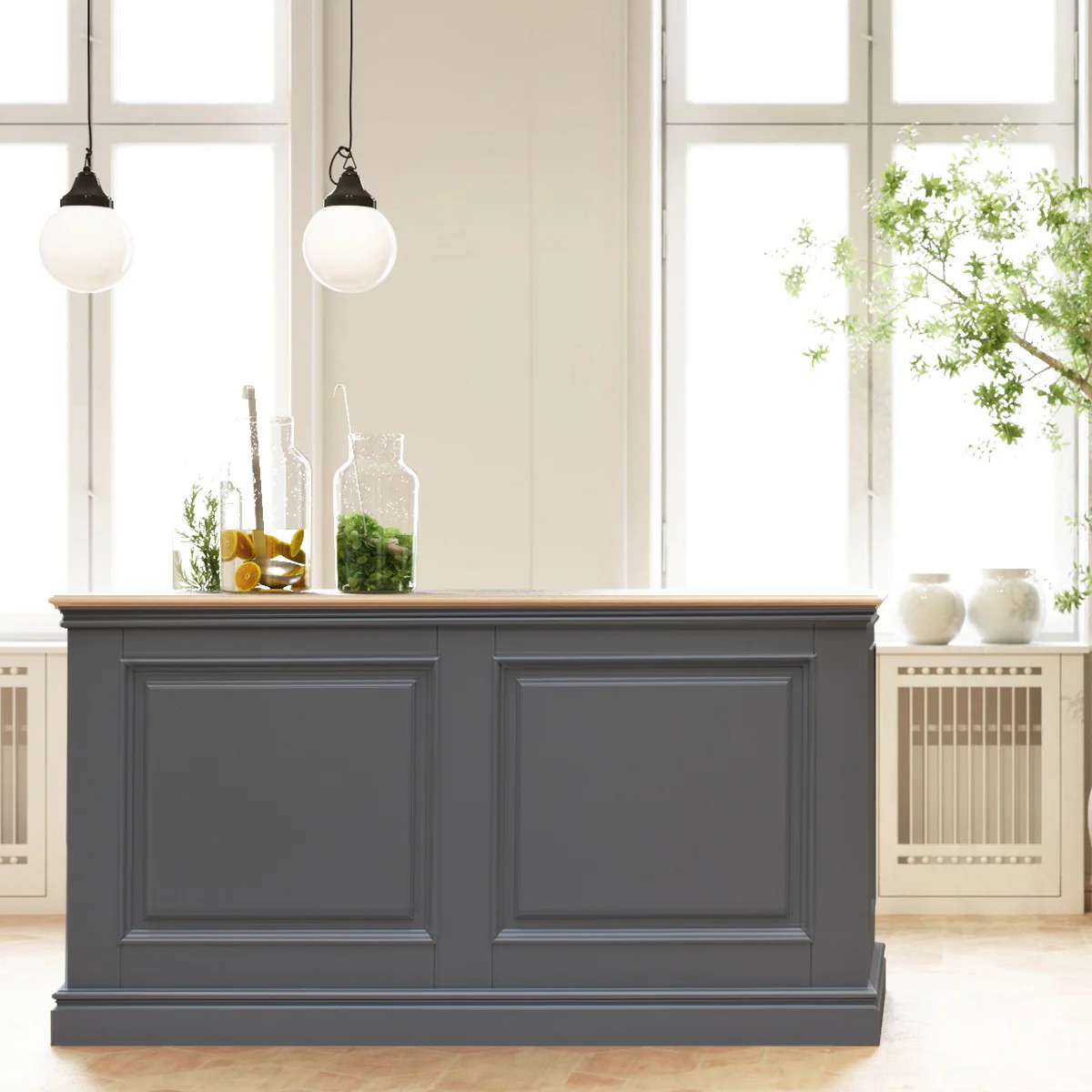 Mit viel Liebe zum Detail ist der Verkaufstisch Vienna ein wahres Meisterstück der handwerklichen Kunst. Der anspruchsvolle Tresen im Landhausstil wird in traditioneller Rahmenbauweise aus Massivholz hergestellt. Die Oberfläche vom Korpus wurde anschließend grau lackiert. Das Innenleben besteht aus einem separat gebauten Korpus. 2 Schubkästen mit Vollauszug und verstellbaren Ablageböden geben reichlich Stauraum. Je nach Einsatz und Verwendungszweck kann der innere Korpus der Kassentheke im Landhausstil auf Ihre individuellen Bedürfnisse angepasst werden.