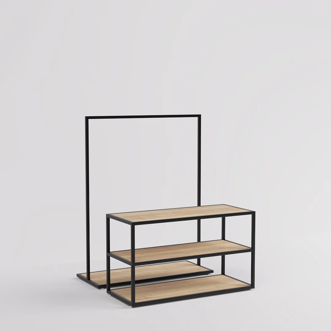 Ein flexibler Präsentationstisch mit einem Konfektionsständer in Schwarz ist stets ein Blickfang. Der Vorteil bei der Einrichtung: Die Kombination aus pulverbeschichtetem, schwarzem Stahl und Holzablagen fügt sich harmonisch in verschiedene Raumkonzepte ein.