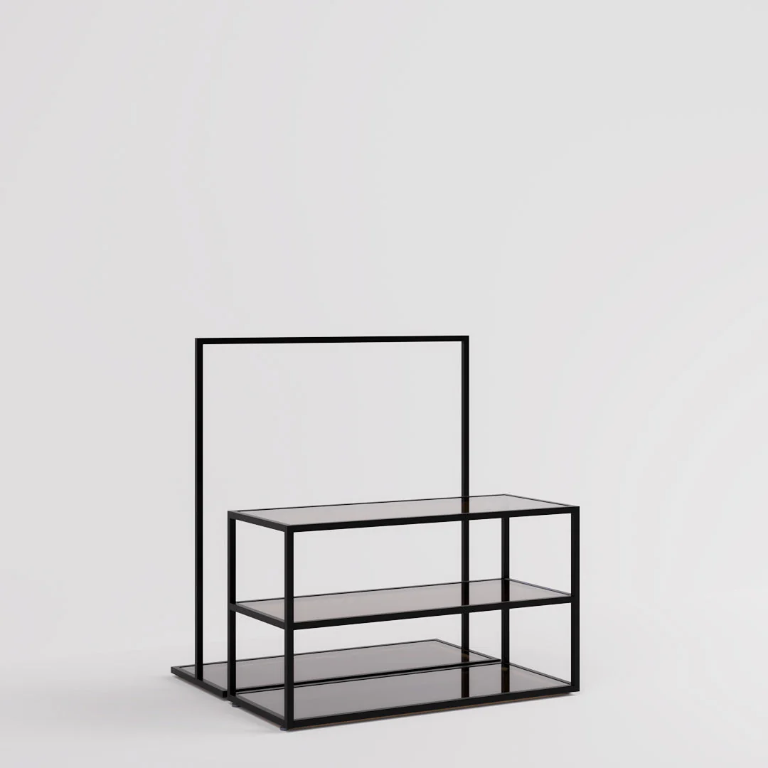 Die Kombination aus schwarz pulverbeschichtetem Stahl und grau eingefärbten Glasfachböden ist ein echter Klassiker. Zeitlos und elegant wirkt der Präsentationtisch und Kleiderständer Como in jedem Raum.