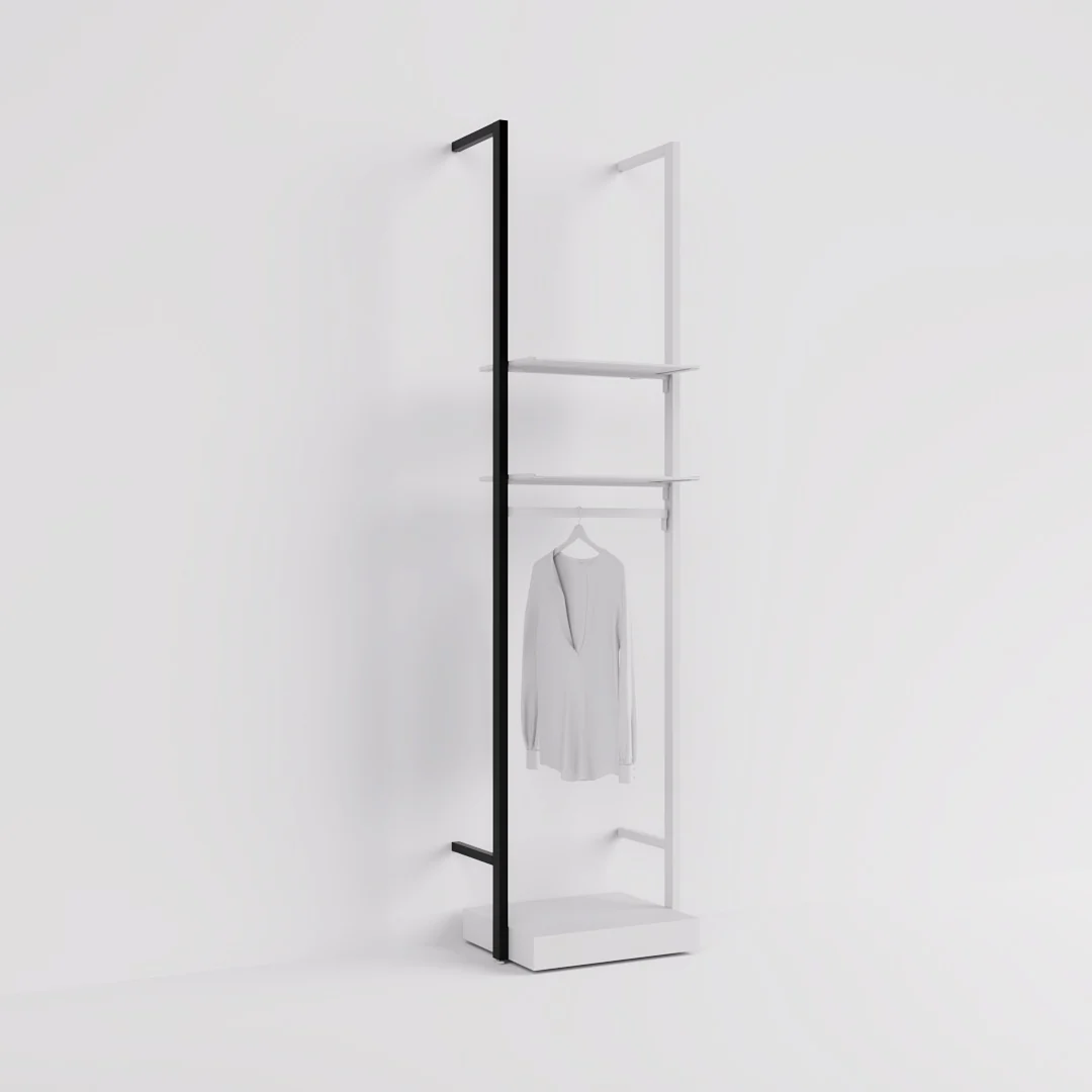 Das Achsmaß ergibt sich aus dem Abstand von Mitte zu Mitte der Säulen (AM 625, AM 1000). Die Wandsäule ist mit einem verstellbaren Fuß ausgestattet, sodass Unebenheiten im Boden mühelos ausgeglichen werden können. Rückseitig ist sie im Raster von 5 cm gelocht, was eine flexible Anbringung von Fachböden und Tragestangen auf der gewünschten Höhe ermöglicht.